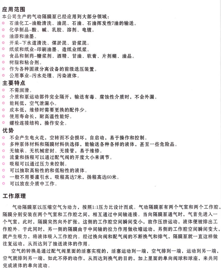 不銹鋼QBY3氣動(dòng)隔膜泵具有質(zhì)量可靠使用壽命長(zhǎng)、噪音底、震動(dòng)小、永不死機(jī)、做工精細(xì)等六大優(yōu)點(diǎn),即能抽送流動(dòng)的液體,又能輸送一些不易流動(dòng)的介質(zhì),具有自吸泵、潛水泵、屏蔽泵、泥漿泵和雜質(zhì)泵等輸送機(jī)械的許多優(yōu)點(diǎn)。